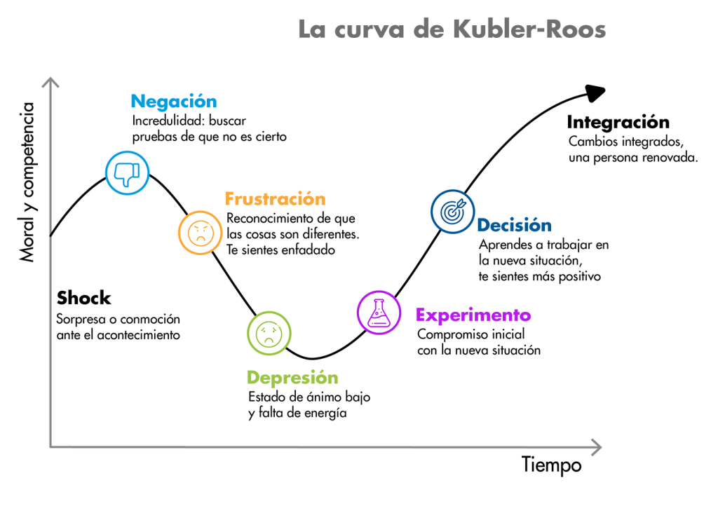 Y, en el medio de esa nube de especulaciones, me di cuenta de que estaba atravesando la famosa curva del cambio de Kubler-Ross, y que estaba en la etapa de enojo. Cuando me di cuenta de esto me entró la risa y pensé: “Soy la resistente al cambio. Soy esa de la que tanto hablamos en los cursos de cómo abordar”. Y me entró la risa, además, porque algo que siempre decimos es que el término “resistente” no es el adecuado, no hay tales “resistentes”: hay personas con historias personales, contextos particulares y emociones universales que tienen sus motivos o creencias para “resistirse” al cambio.