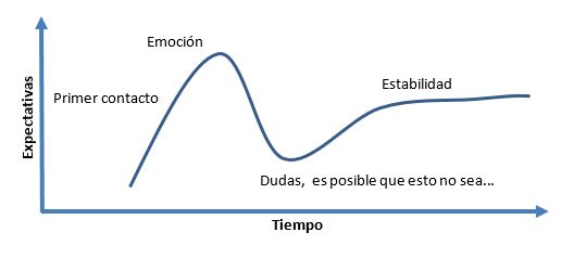 Si el gráfico anterior representa las expectativas que tenemos sobre un cambio podemos apreciar que una vez hemos establecido contacto con LEAN, vemos rápidamente sus potenciales beneficios y nos emocionamos, empiezan a llegar los éxitos con nuestro primer VSM (Quick Wins), nuestras primeras experiencias. Lo mismo que ocurre cuando estamos las primeras veces con la persona que nos atrae…”qué bonito lunar que tiene en la nariz!”, las mariposas en el estómago..