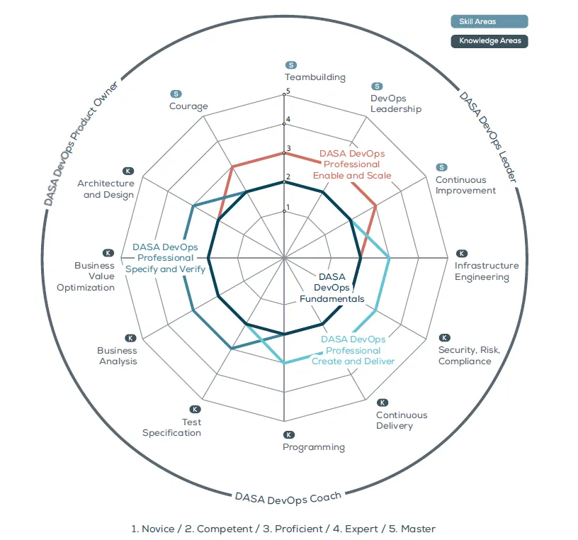 Con este catálogo de conocimientos y habilidades no es de extrañar que sea precisos mecanismos formales que garanticen la completitud y actualización del contenido, y un esquema que los organice para los distintos roles del modelo. Esto se manifiesta en el rango competencias para cada uno de los roles. Cada habilidad y área de conocimiento del modelo tiene una escala de 1 a 5, y cada rol una combinación de los diferentes grados de habilidades y conocimientos necesarios. Así, por ejemplo, éste sería el rango de competencias para los tres roles del nivel Professional de DASA (Create and Deliver, Enable and Scale, Specify and Verify) más el nivel de Fundamentos: