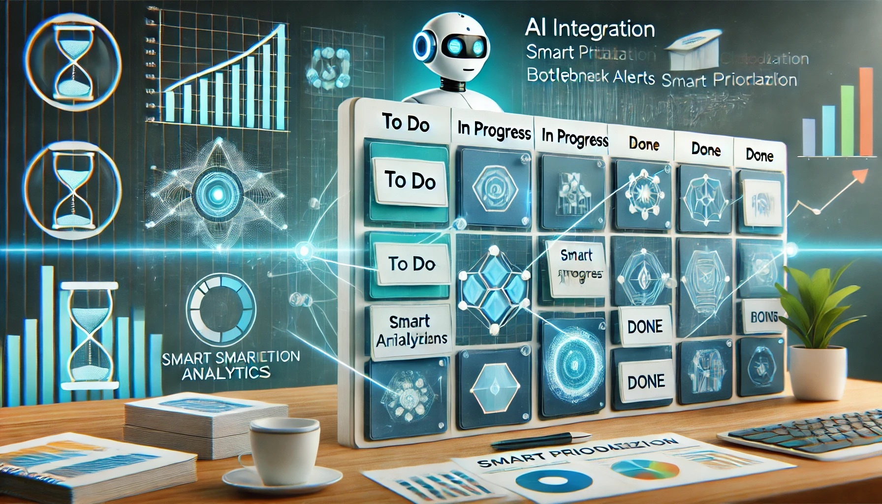 La IA puede potenciar el uso de Kanban proporcionando mayor visibilidad, análisis, predicción de cuellos de botella y sugerencias en tiempo real. Un agente de IA es un sistema autónomo o semiautónomo diseñado para analizar datos, aprender patrones y tomar decisiones o hacer recomendaciones basadas en ellos, actuando como un asistente inteligente. Veamos algunos ejemplos de cómo esta integración podría transformar el trabajo de los equipos: