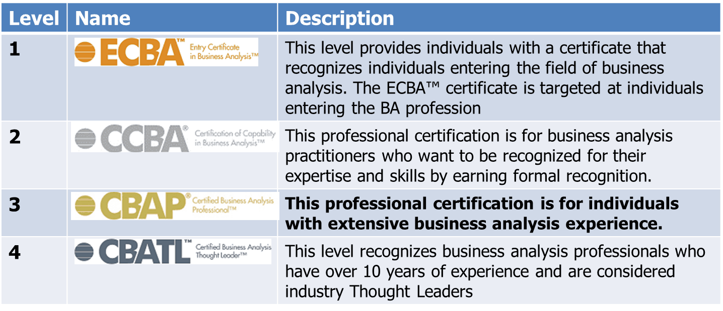 El CBAP forma parte de los cuatro niveles de certificación que actualmente ofrece el IIBA. Estos niveles son los siguientes: