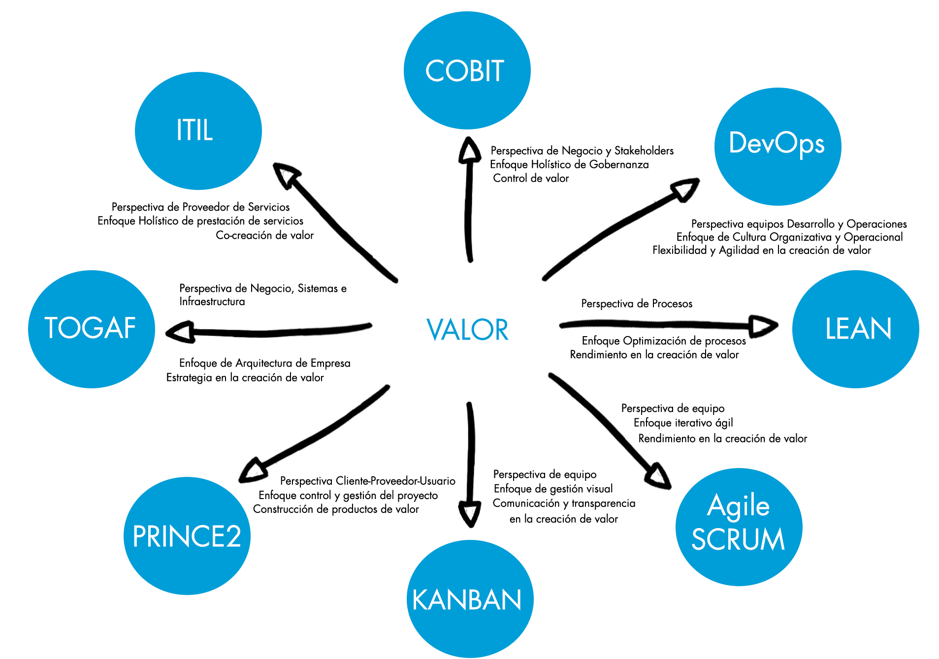 ITIL®  es un marco que abarca toda la problemática de un proveedor de servicios TI de extremo a extremo, desde que aparece una Oportunidad o Demanda hasta que el proveedor entrega una solución que resulta en valor para el cliente. Incluye las dimensiones de Organizaciones y Personas, de Información y Tecnología, de Socios y Suministradores, y de Flujos de Valor y Procesos. Se apoya en el resto de frameworks para aspectos específicos técnicos o de gestión. Plantea que la creación de valor ha de ser un ejercicio de colaboración entre suministradores, el proveedor y el cliente (co-creación del valor).