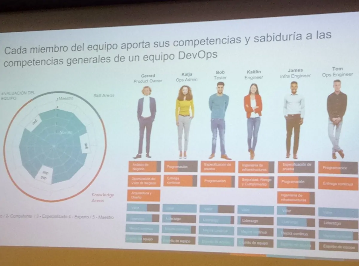 Después de que Deborah nos contara la situación actual del mercado DevOps, la misión y principios de DASA y el modelo de competencias me tocaba el turno a mí pero tuvimos la suerte de que Helder de Oliveira como Head of DevOps en Kairós Digital Solutions nos transmitiera su impresión desde el punto de vista de implementar DevOps en diferentes organizaciones y como el modelo propuesto por DASA les ha facilitado su labor, en especial la herramienta de Competence QuickScan™ consiguiendo que cada persona pueda analizar sus fortalezas y debilidades según los 4 áreas de Skills y las 8 áreas de Knowledge.