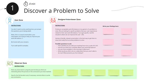 • Finding an acceptable work-life balance is too generic of a problem to solve. We are looking for specific problems that your user experiences related to their own work-life balance. Try to get specific, real-life situations where we can improve the user’s life.