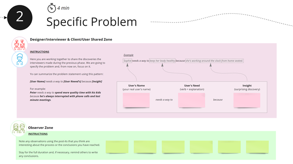 • Here you are working together to share the discoveries the interviewers made during the previous phase. We are going to specify the problem and, from now on, focus on it.