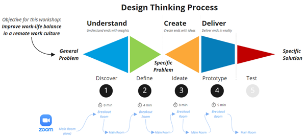 Since our design thinking workshop was only 50 minutes long, we dedicated the first 10 minutes to explain what is Design Thinking, and approximately 35 minutes to going through the process of the Design Thinking process, and covering the phases of Discover, Define, Ideate and Prototype. We did not include the Test phase for timing reasons. Here is a graphical representation of the agenda of the workshop: