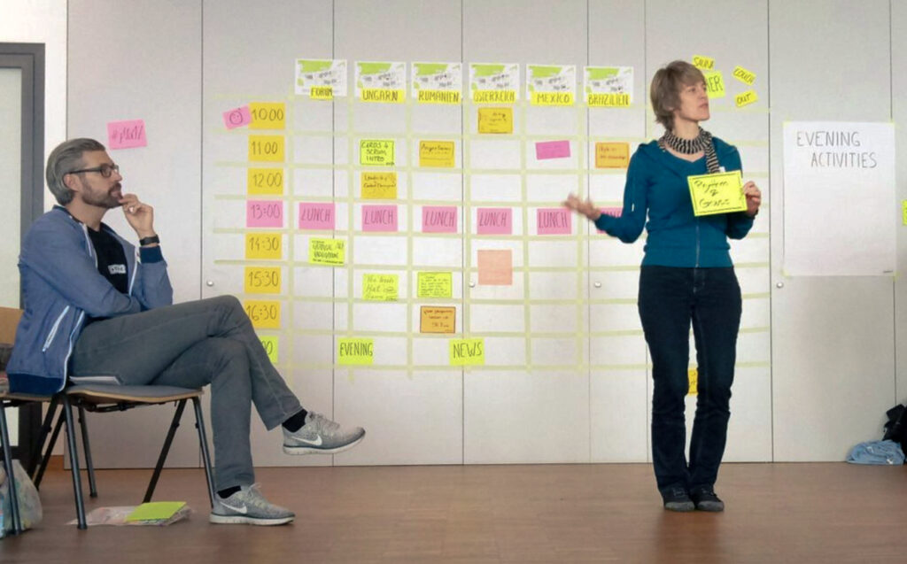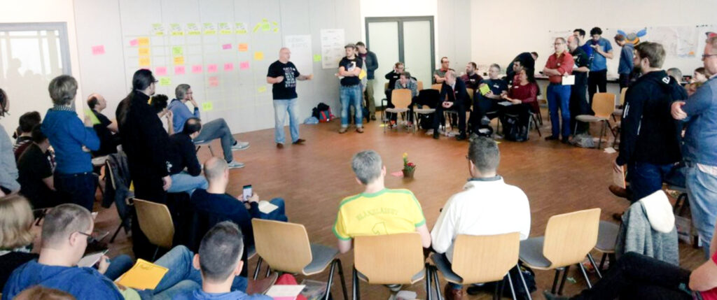 For example, in this photo, we can see the moment of proposing sessions at the Play4Agile event, held annually in Germany. You can see the two rows of people waiting their turn to propose a session on both sides of the semicircle.