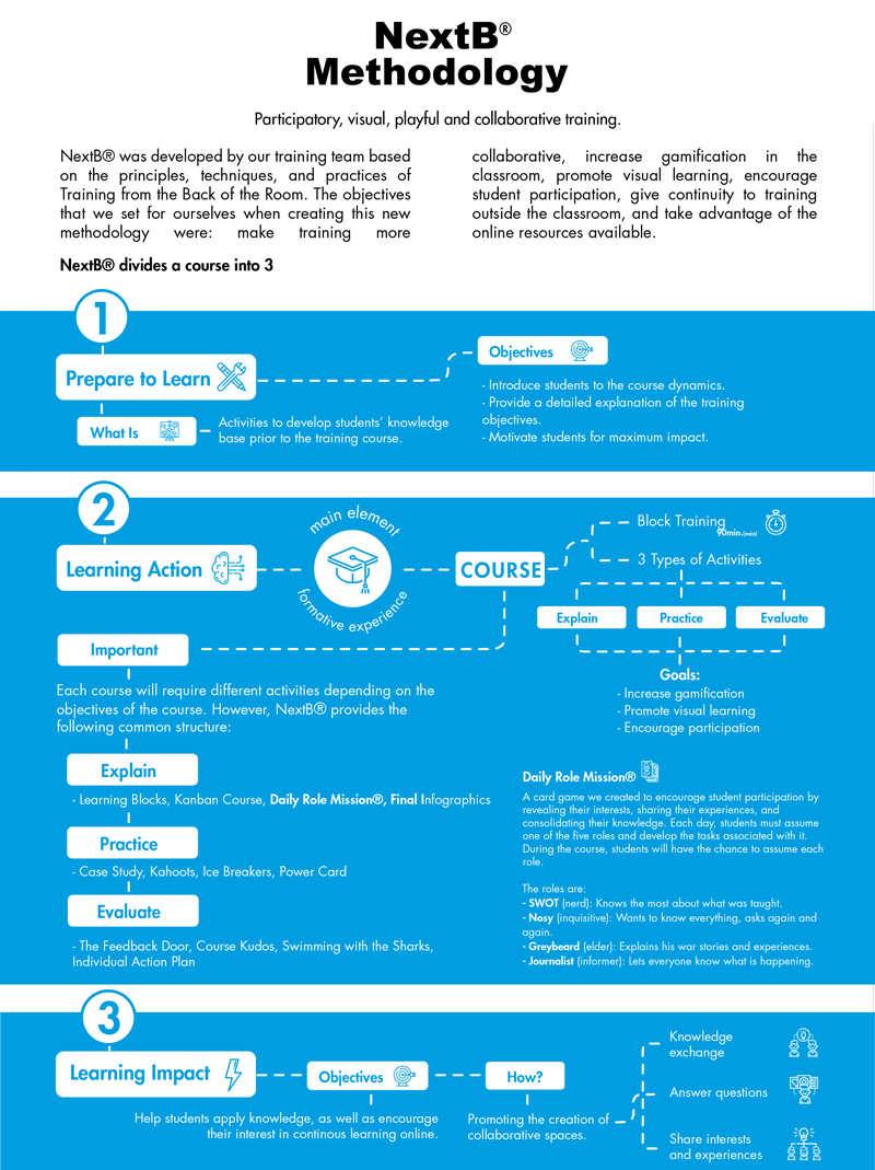 As Training from the Back of the Room says, “images trump words”, we created an infographic to help explain the detail in each phase of our NextB® training methodology.