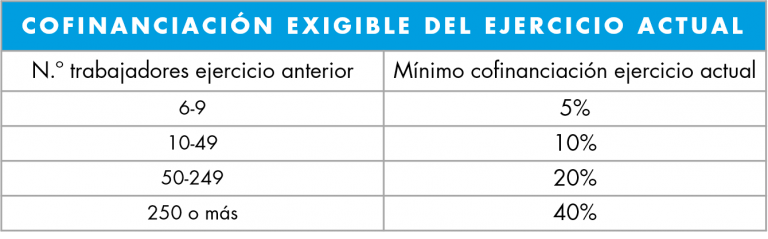 La empresa tiene la obligación de cofinanciar una parte de la acción con costes de formación, gastos derivados de la organización del curso o con costes salariales (costes en salarios de los trabajadores que realizan la formación en horario laboral). El coste salarial se puede calcular alumno por alumno o general de la empresa.